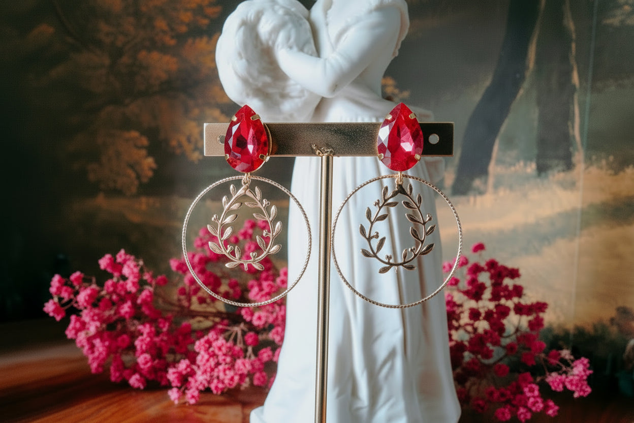 Clips dorés à l'or fin, sertis de rubis roses de laboratoires, obtenus en fusionnant du minerai brut de rubis rose. Breloques laurier plaquées or 18 carats. Réalisées par Marie.
