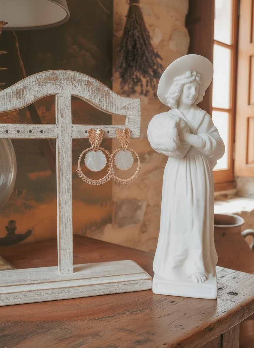 Créoles en acier inoxydable ornée d'une breloque centrale en nacre naturelle sertie dans un alliage de zinc, montées sur clous d'oreille feuilles dorés à l'or fin.