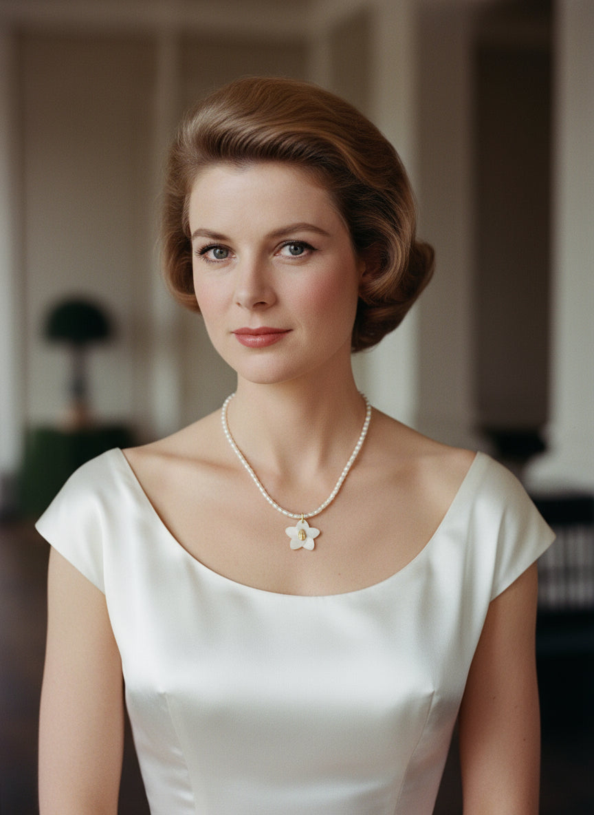 Collier de mariée , motif floral, et sertissage de médaille miraculeuse en plaqué or, monté sur chaine en perles de culture. Réalisé par Madeleine.
