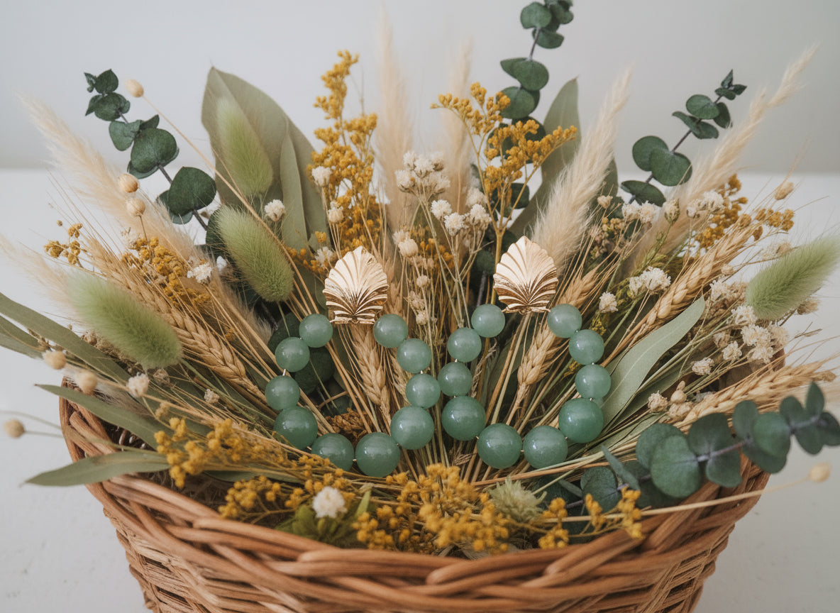 Créoles munies de perles d'aventurine montées sur clous d'oreilles feuilles dorées à l'or fin.