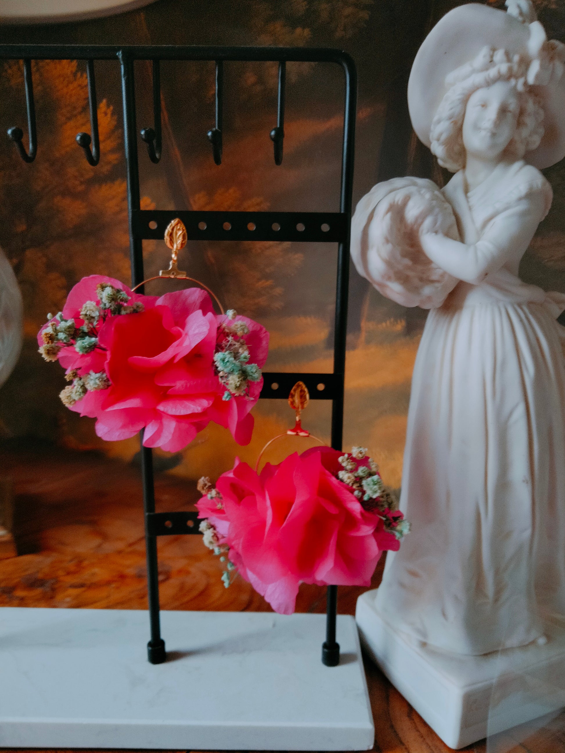 Créoles en acier inoxydable garnies de fleurs d'hortensia macrophylla séchées rose fuschia, montées sur clous d'oreilles en feuilles légèrement dorées à l'or fin.