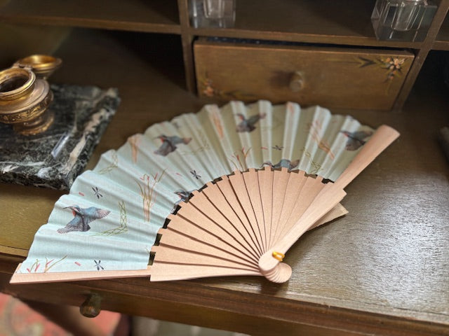 Eventail en bois et tissu 100% coton certifié OEKO-TEX. Les motifs ont été dessinés par nos soins puis imprimés sur tissu, vous ne les trouverez donc nulle part ailleurs!
