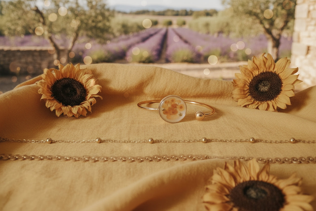 Jonc plaqué or, orné d'une impression haute définition des Tournesols de Van Gogh et sertissage dans un travail de résine dosée et coulée à la main, pour fabriquer un cabochon sur mesure, élégant et inamovible.