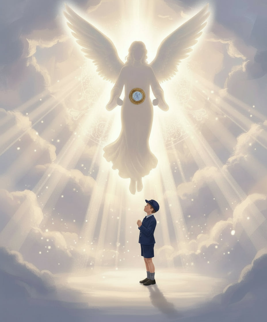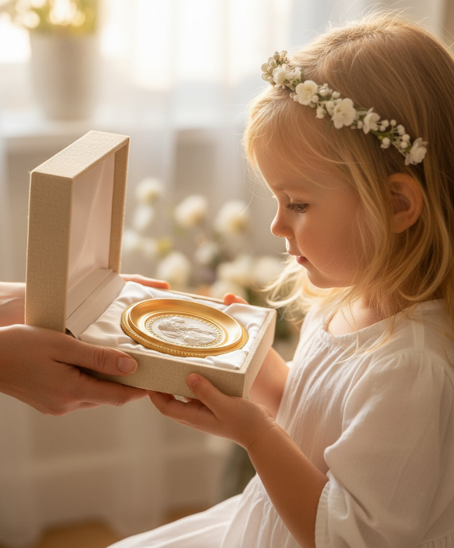 Cadre en bois doré , motif central du Bon Pasteur, plâtre. Rond et blanc comme l'Hostie, cadeau idéal de Première Communion. Réalisé par Madeleine.