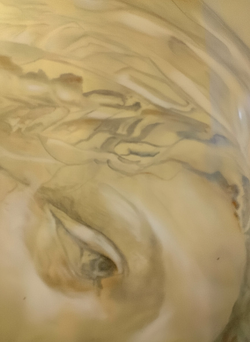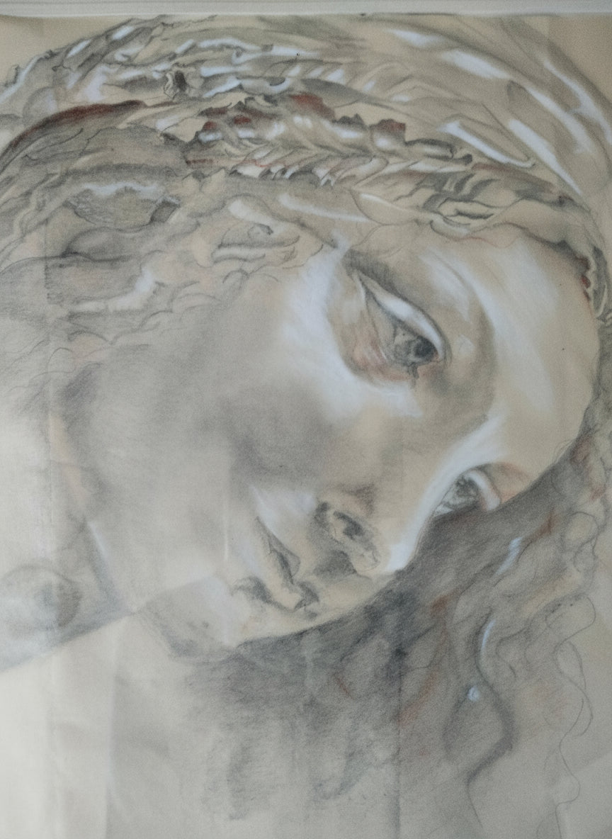 Dessin d'un détail de tableau de Léonard de Vinci, réalisé au crayon gras, crayon blanc et sanguine. Cadre réalisé par une professionnelle de l'encadrement et de la dorure.