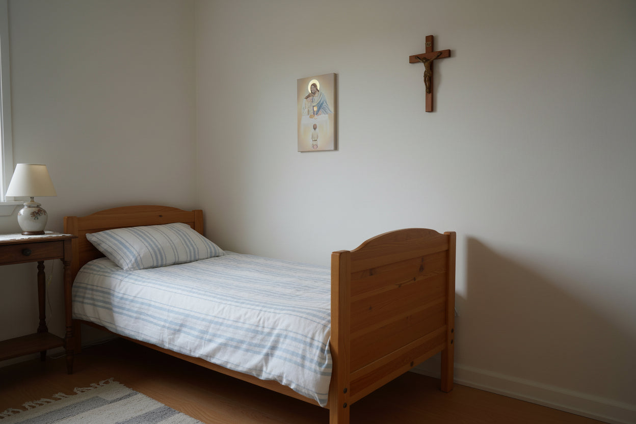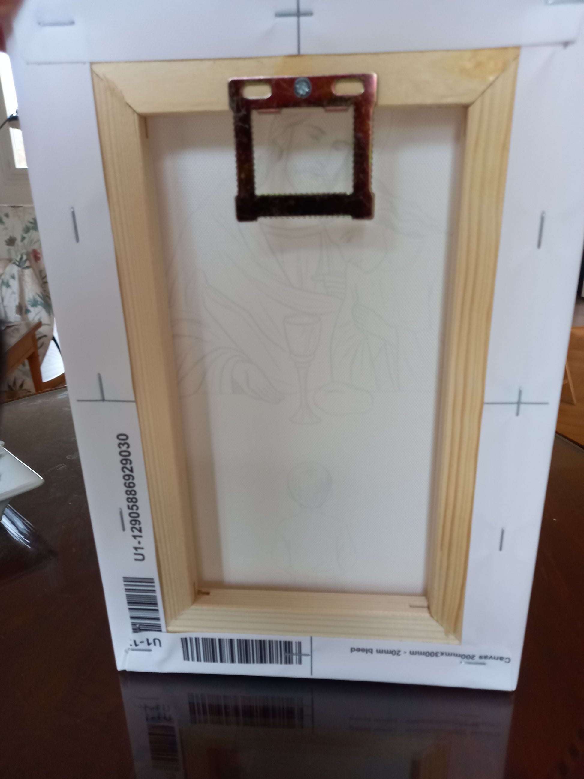 Dessin de Madeleine. Imprimé sur toile de coton, fixée sur un chassis en bois. Système d'accrochage au dos. Toile de 20x30 cm. Ce modèle représente Notre Seigneur Jésus-Christ et Saint Jean au moment de la Cène.